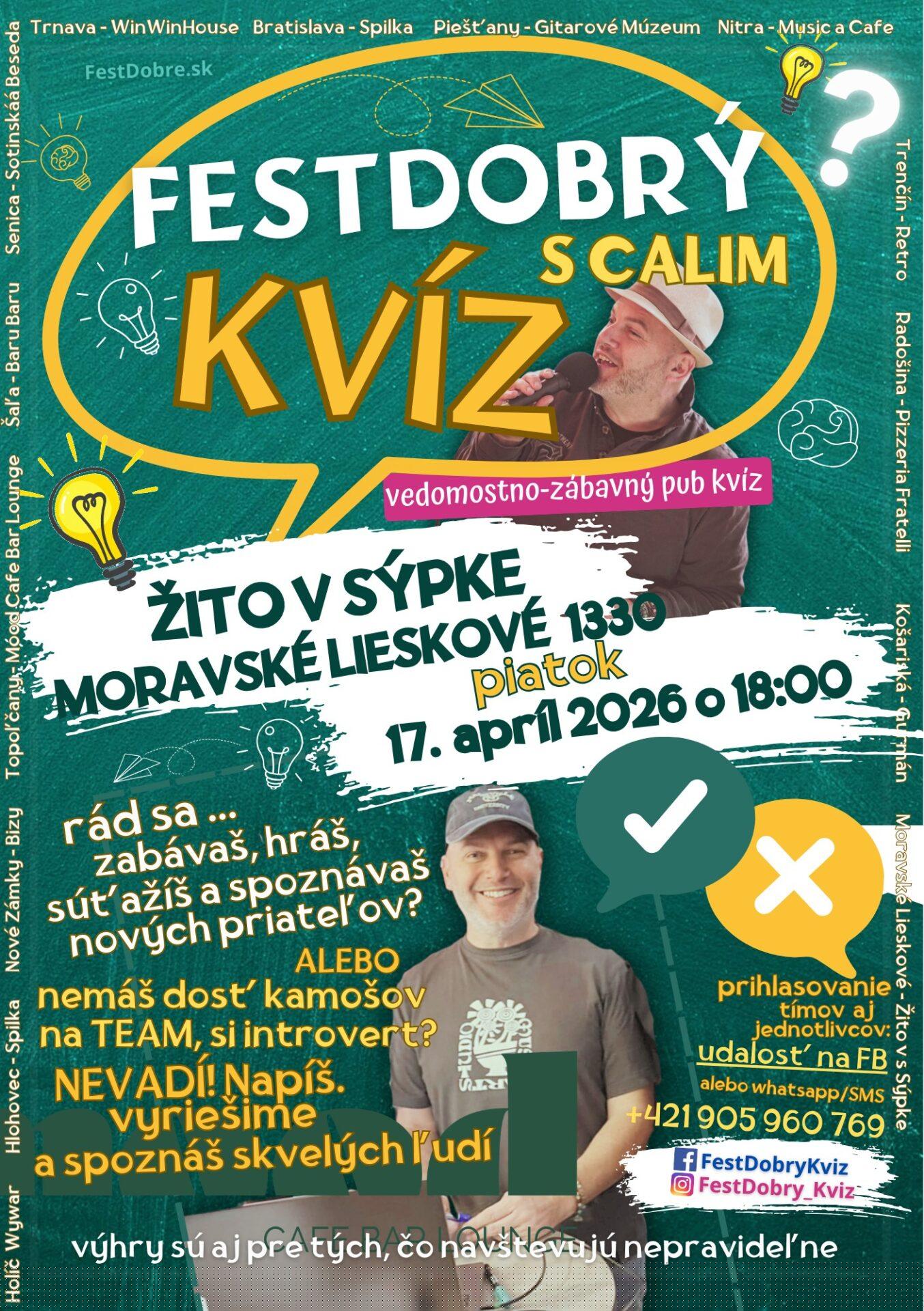 FestDobrýKvíz s Calim je úspešný vo viac ako 15tich mestách a prichádza aj do srdcu blízkeho Žita v SÝPKE v Moravskom Lieskovom.